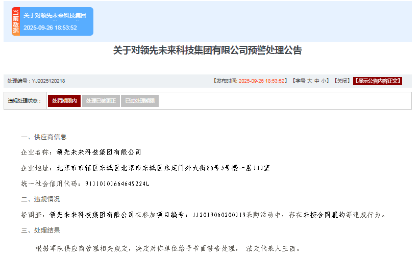 预警处理公告显示,经调查,领先未来科技集团在参加项目编号JJ2019060200119采购活动中,存在未按合同履约等违规行为。对此,处理部门根据《军队物资工程服务供应商管理规定》,决定对该单位给予书面警告处理,预警时间2025年9月26日,违规处理状态为处罚期限内。