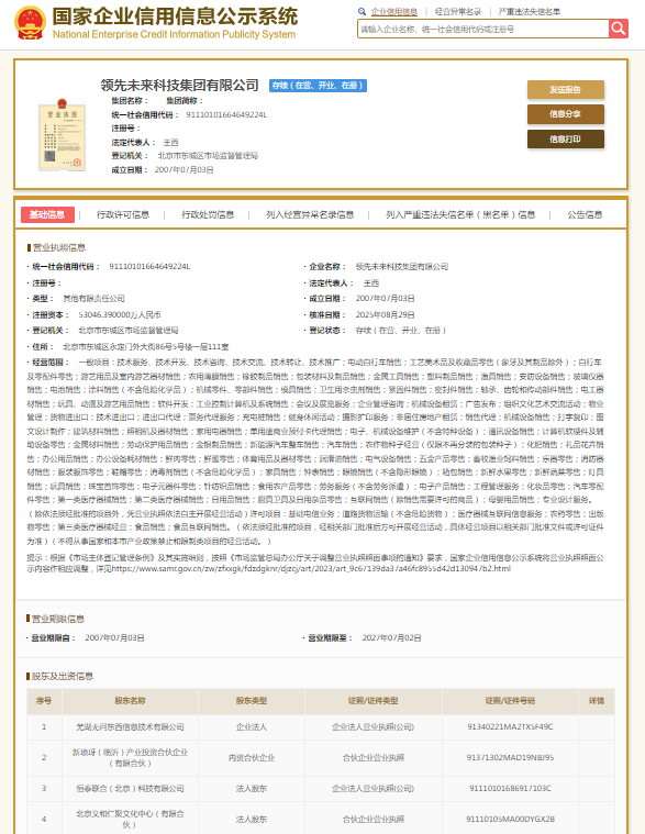 国家企业信用信息公示系统显示,领先未来科技集团有限公司成立于2007年,注册资本53046.39万元人民币,法定代表人王西。